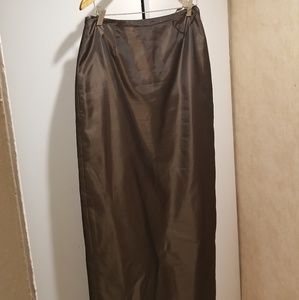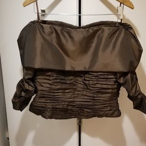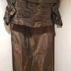 Rubin Bronze/Brown 2 piece maxi dress with slit in back. Off shoulder with elastic sleeves/waist. Polyester. Zippered .