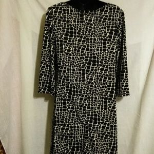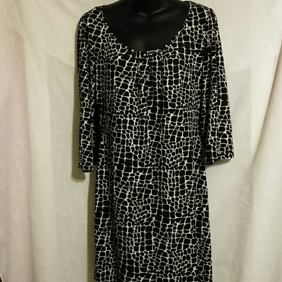 Long slightly flared sleeve. Round neck line. With waist sash included. Soft stretch fabric. 31.5 inches from back neckline to hem.