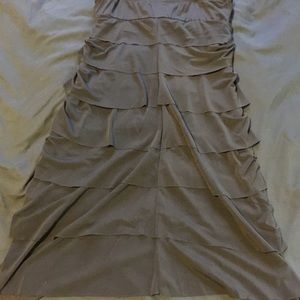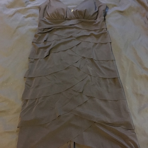 Small Black ruffled v neck dress with crystal embellishments on straps, lower thigh/little above knee length. Worn twice