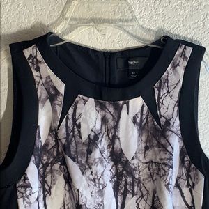 Black and white dress with block patterns. The back is completely black with a long zippier
