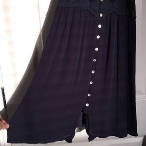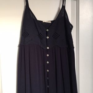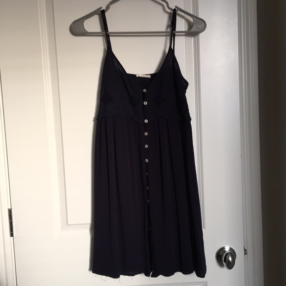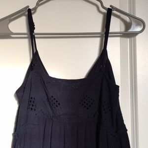 Short navy blue spaghetti strap dress. Straps are adjustable. Cut out patterns on top portion of dress.