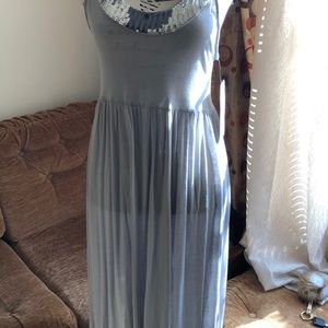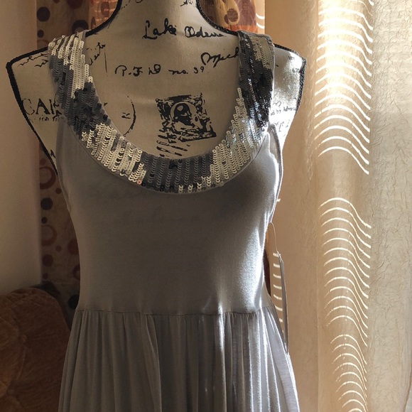 It is gray and silver dress with sequence around the low cut chest area. The sequence is black and silver. It is brand new with tag.