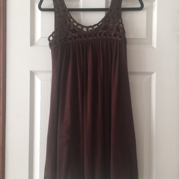 Brown dress, with tie in back , detailing peek a boo-neck line