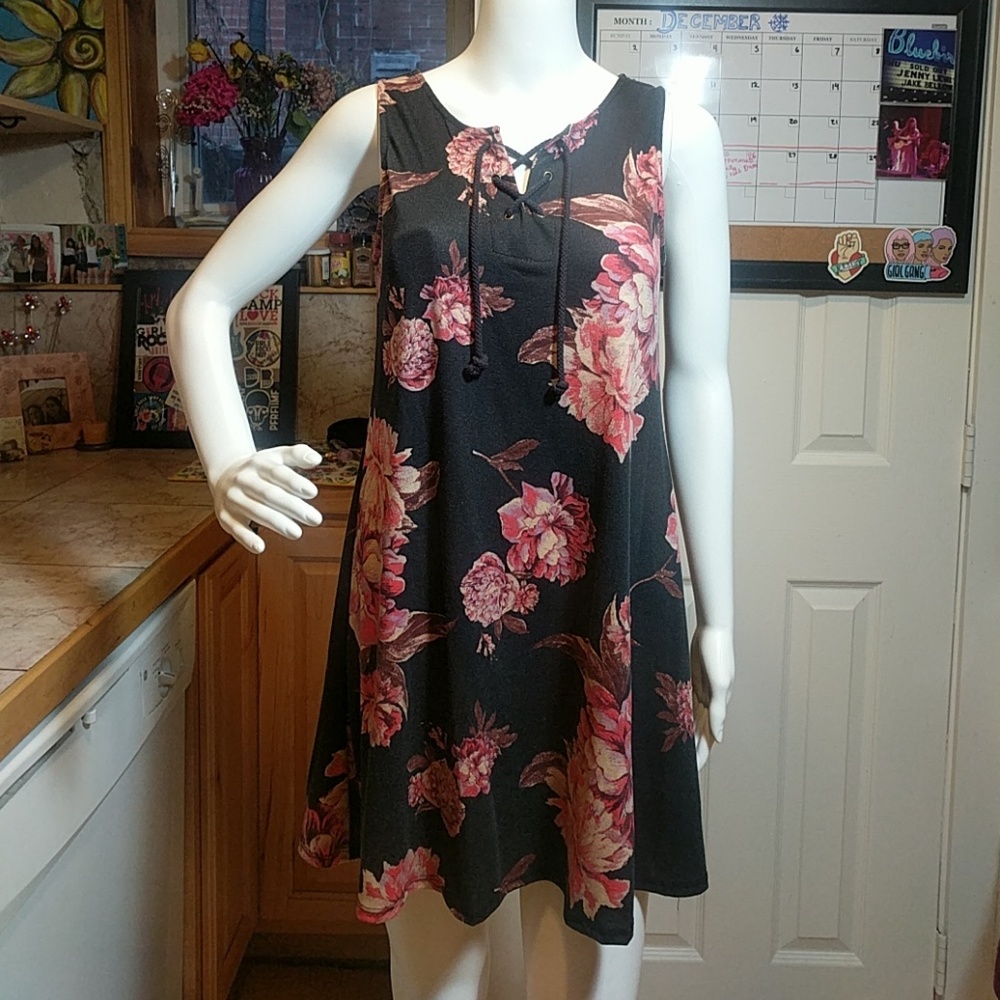 Short, loose fitting floral dress, dark navy blue (or light black?) with large print flowers (pink, mauve, light purple and white), About A Girl brand, size small. drawstring opening at neck.
