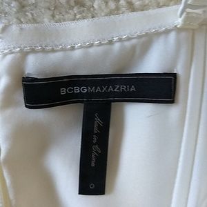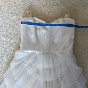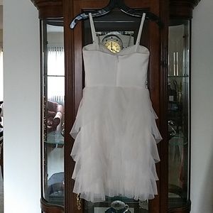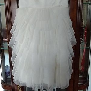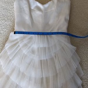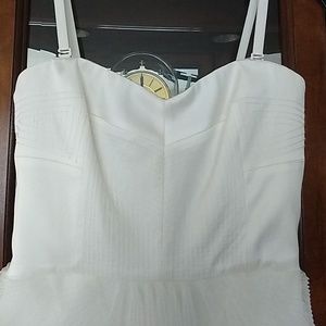 Absolutely stunning dress by bcbg in a soft off white. Has gorgeous stitching on the top with adjustable straps. Zips in the back and has beautiful ruffles from the waist down.