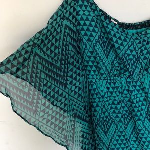 One shoulder, sheer billow sleeve. Elastic and tie waist. Mid thigh. I wore this once for my bachelorette party 😉