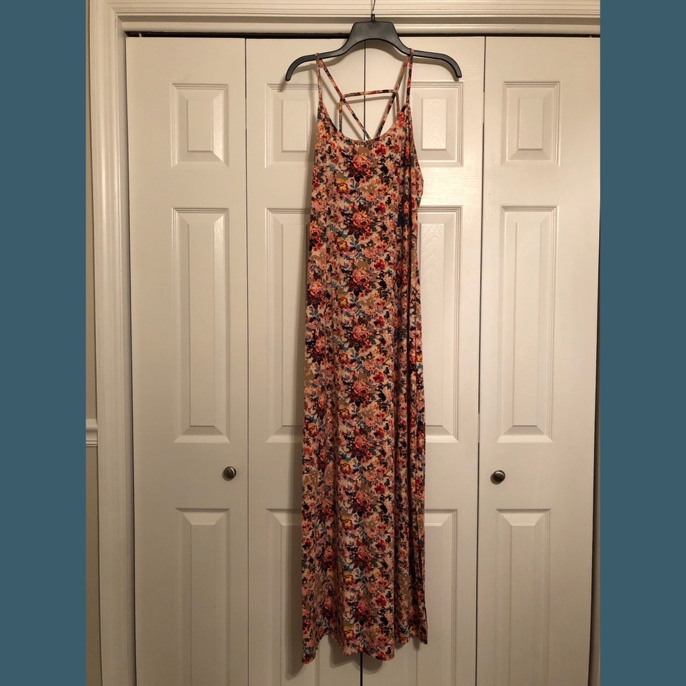 Long maxi dress. Slits on both sides mid calf. Spaghetti strap with design on back.