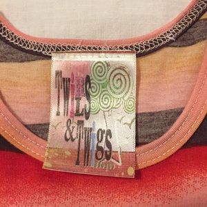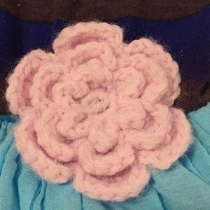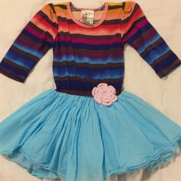 This dress is so cute with boots. Coral, brown n turquoise striped top w a lightly tulle lined turquoise skirt. Embellished w a light pink knitted flower. Worn a hand full of times. Will iron upon selling and before shipping.