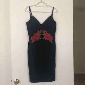 Black velvet strap dress. With crocheted roses under the bust. Knee length. Never worn