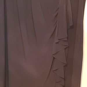 Black cap sleeve evening dress finished with a rhinestone accessory which shows off the cascading flow of the dress.