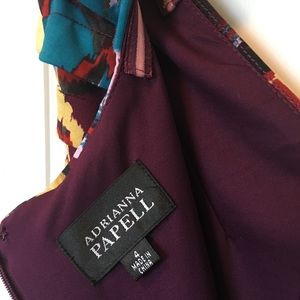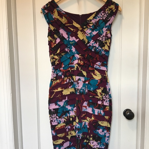 Midi length Adrianna Papell in EUC, falls just above the knee. Wore to a wedding once! Very flattering stretch and unique artsy pattern. Says size 4 but I think it runs a little big - I am between a 6/8