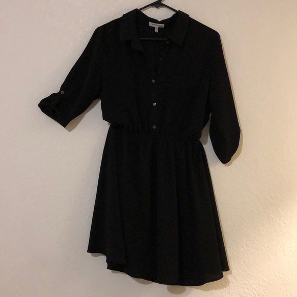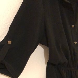 Black, stretch waist, copper color buttons. Under skirt. Super cute with tights and rain boots for winter or black heels in the summer.