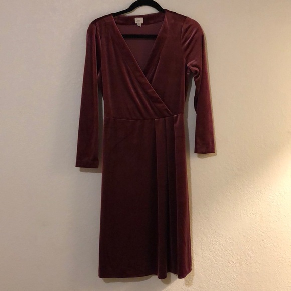 Soft velvet, coppery maroon color. Waist sits high with cross front detail. Hides everything and shows off exactly what it should :). Dress length is just below the knee. Super cute with tights and boots