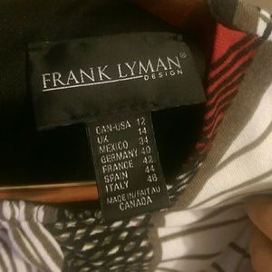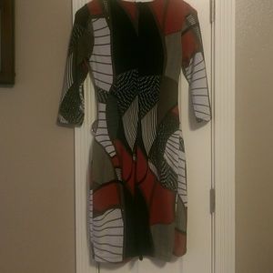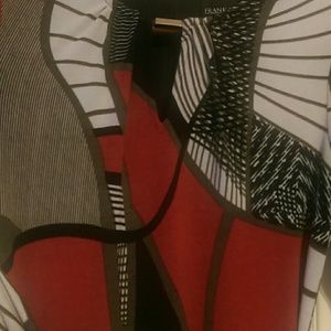 Red , black and white geometric pattern with faux drape and gold buckle 3/4 sleeves. Very soft. Made in Canada.