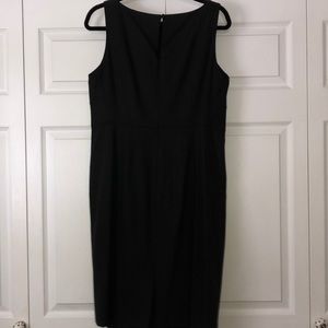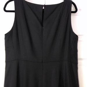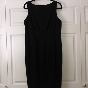 Black fitted high neckline dress, 2 side pockets, pleated front waist, zip up back.