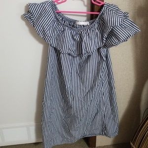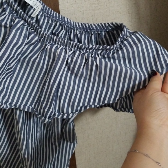 Navy/grey and white stripe. Simple and cute. 97% cotton 3% spandex ruffles around the neck collar. Can be worn off the shoulder which adds a nice touch to it.
