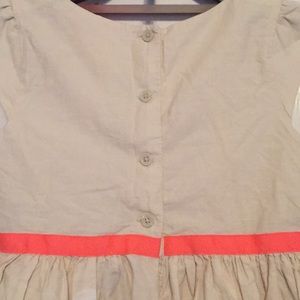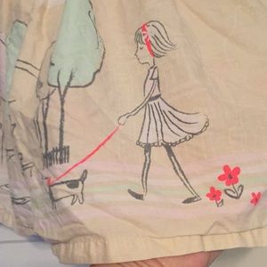 Cute summer sleeveless dress. City street scene along the lower half in grey, mint, pink and apricot in a style that looks hand drawn. Cotton shell, poly lining with a very small amount of pouf provided by a