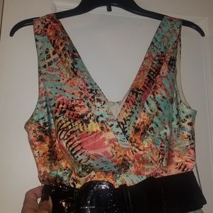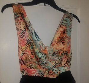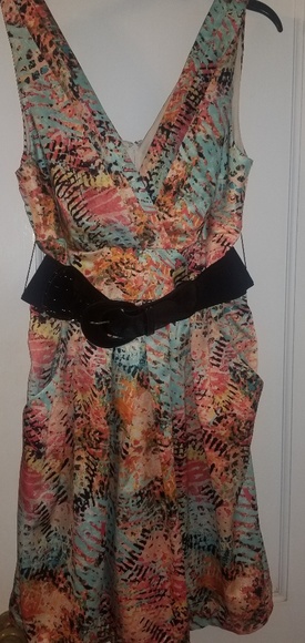 Multi color. Empire Waist. V neck and back. Belt and pockets. Back Zipper. Worn once.