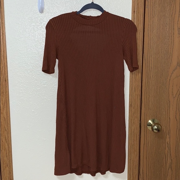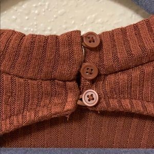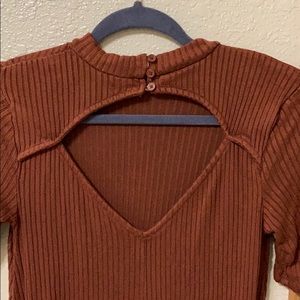 orangey/dark brown color short sleeved peep in back and is a button up on neck autumn style xs