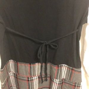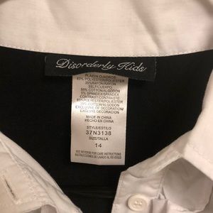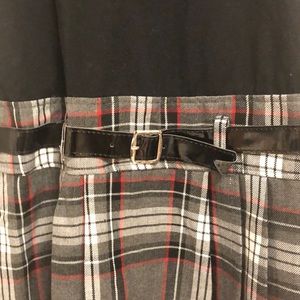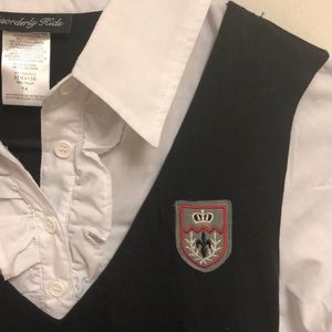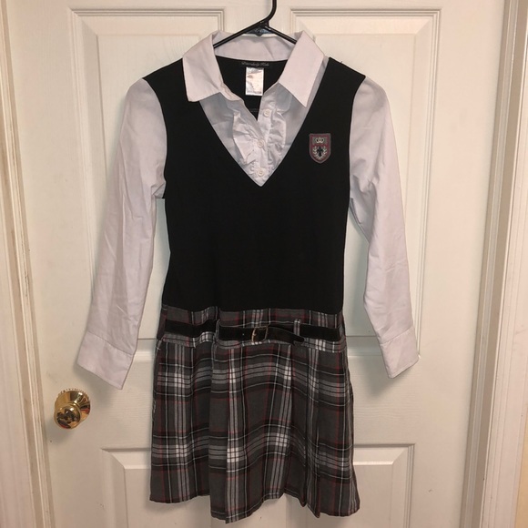 Prep school uniform inspired dress. Beautiful grey tartan skirt with faux belt, white poplin shirt, black v neck vest with crest. This is all one piece made to look like a layered outfit. Tie back for a perfect fit.
