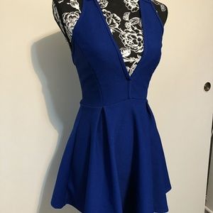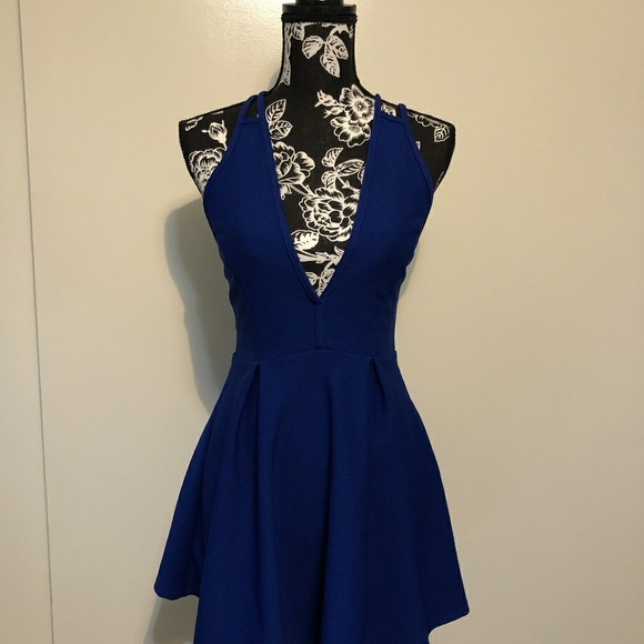Royal blue mini dress, plunging neckline, sleeveless, criss cross back