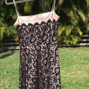 Tessuto Black Lace A-Line dress with strap and bodice size 6. Fully lined skirt flares out in A Line .Side zipper and hook closure