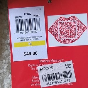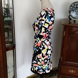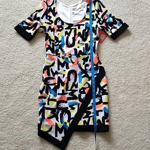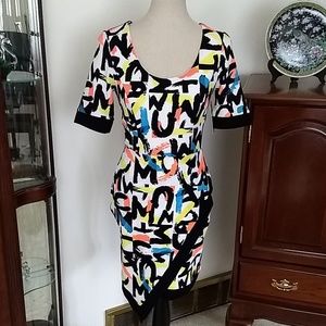Super sharp dress from Marilyn Monroe collection in a cool assemtrical look with a scoop neckline. The colors are fun and vibrant. It is lined and zips in the back. Model is 5'7". It is new with ticket