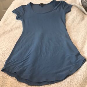 A slate blue sort of color that is really pretty. It’s also super soft! It is tight fitting and the bottom part is shorter in on the slides and then longer in the front and back. It’s never even been worn before!