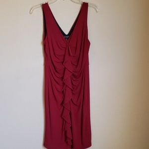 Knee length, ruffles going down the middle of the dress, good stretch.