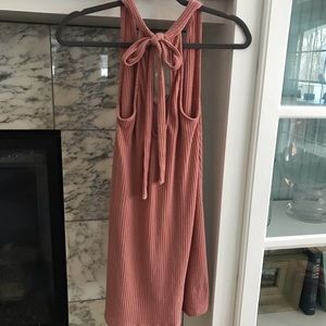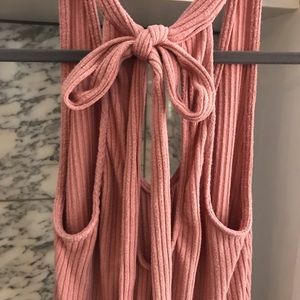 The color is dusty rose? Dark blush? Hard to describe but the true color came out well in the photos. Tie back, pullover, no zip.