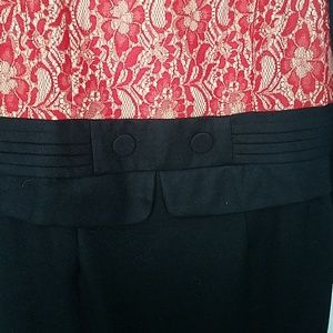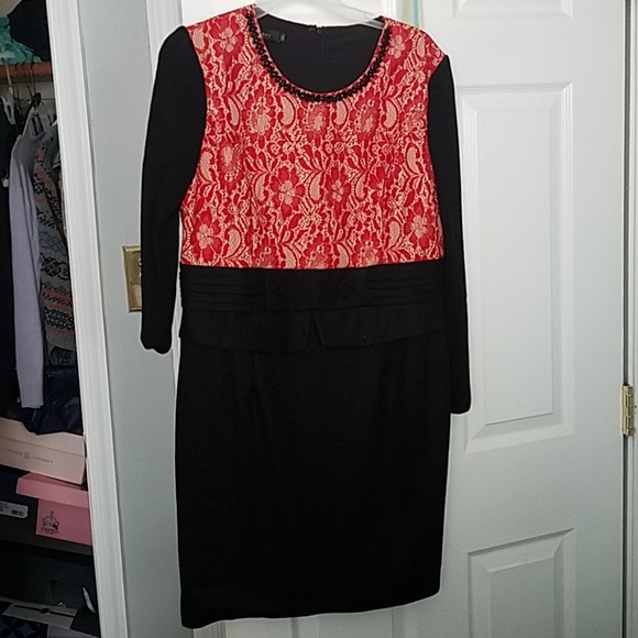 Cocktail dress with red and gold lace, black beads around neckline, sweater material sleeves