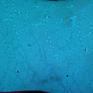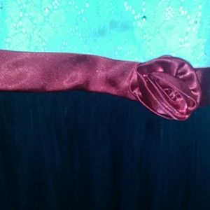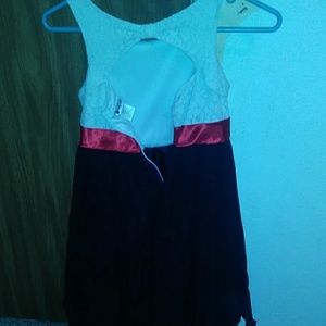 At the top it has white lace with diamonds in the front they are not real the back has a bow that ties it together it is a tank top it has a red lace in the Middle with a rose on it and it has a black skirt on the bottom that is very pretty it is kind of warm actually but yeah it's I think it's very beautiful