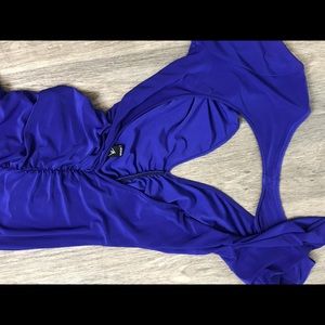 Long dress with mid cut... size small originally but got it tailored so it’s an xs... v neck opening and back