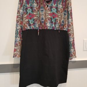 New. Cute dress. Top part slinky (poly) w/bell sleeves toward the bottom. Bottom part of dress is stretchy and above the knee. Hugs all curves!