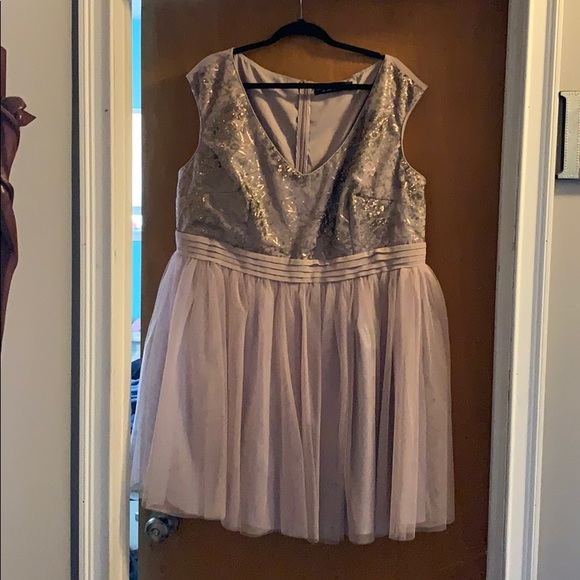 A purplish/mauve dress with tulle skirt and silver sequin bodice. Only worn once for a wedding, got lots of compliments. No stains or rips