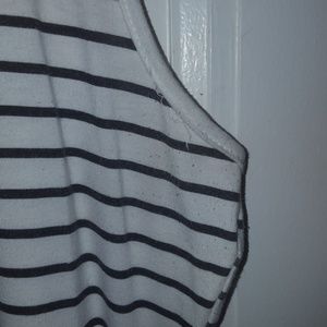 White and black striped dress, fitted & stretchy, falls just below the knee. Size says XL, but guys more like a M/L