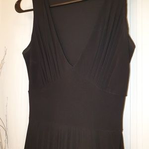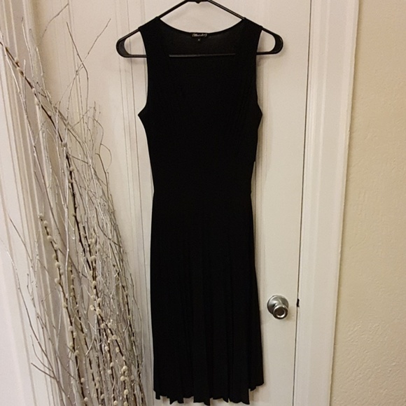 Black pleated v-neck dress, very flattering, knee length, little staining under arm, can be cleaned off