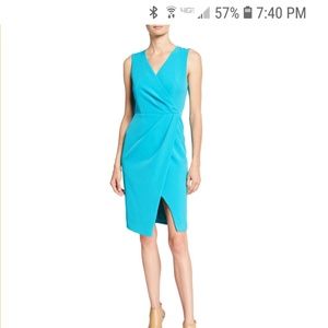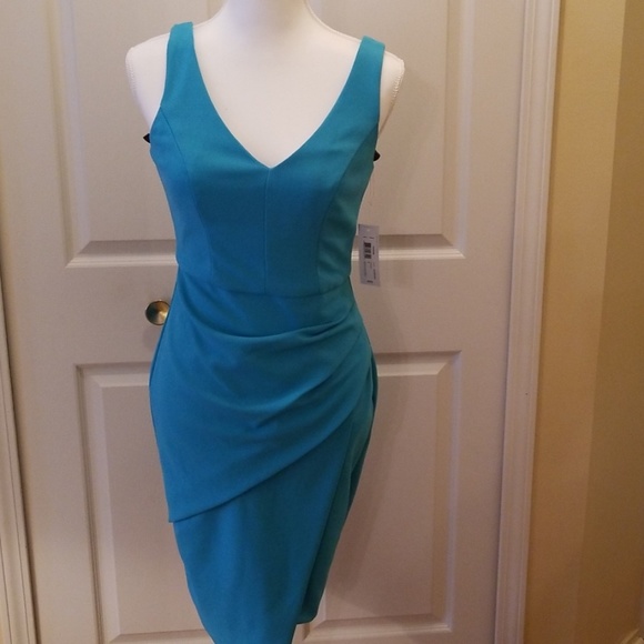 BRAND NEW Turquoise cocktail dress. Sleeveless with zipper back and front ruching.