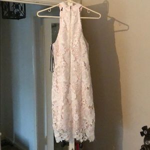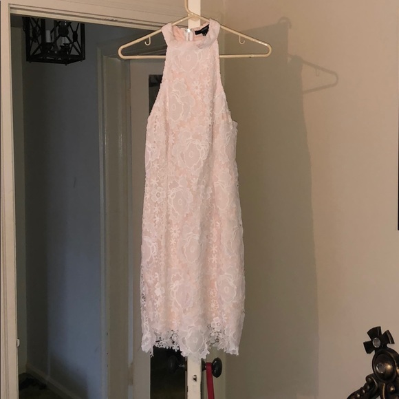 White lace with a high neck and a zipper going down the back it’s a halter