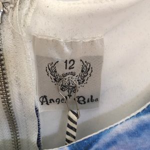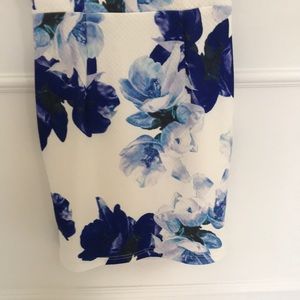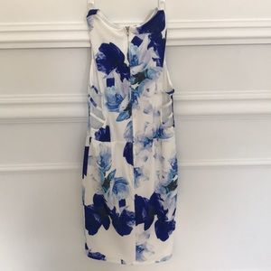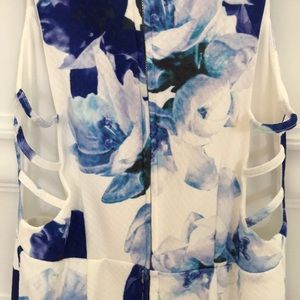 Dress with side cutouts. White with purplish flowers.