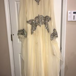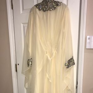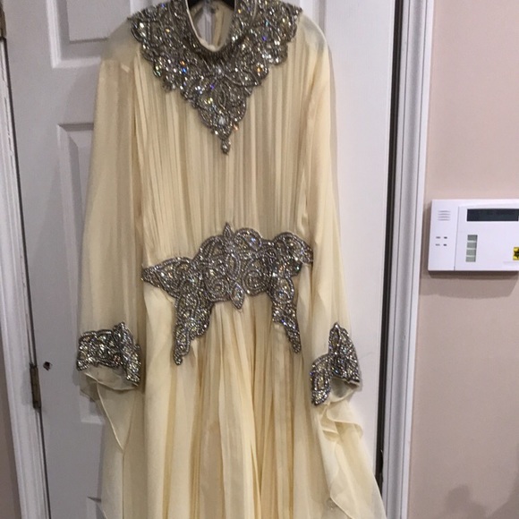 Light yellow kaftan dress with crystals and stones. Used condition has a few stains that will go away with dry clean. Very beautiful heavy hand beaded dress