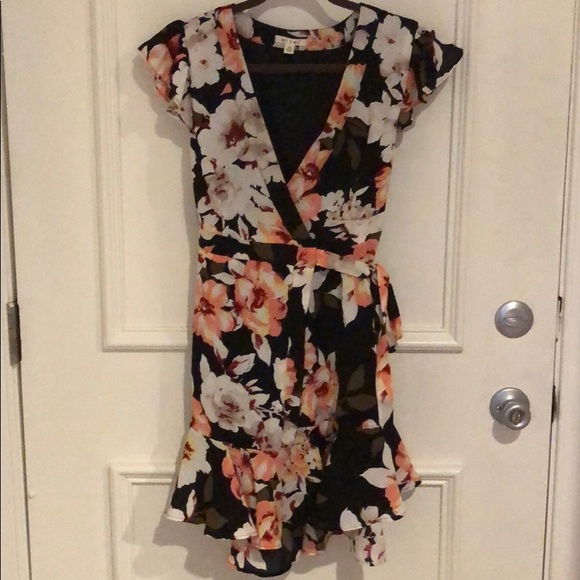 Super pretty/flirty floral wrap dress...short ruffle/flare sleeves and a ruffle/flare hem... short to long... worn once