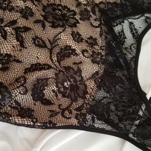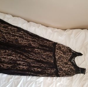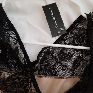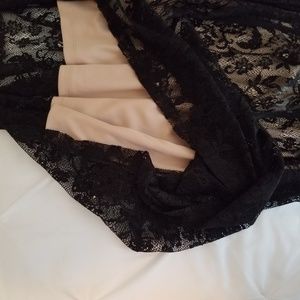 Nude colored slip with black sheer covering with a floral pattern on it. Lightweight stretchy material. Very comfortable. Nude slip stops at a sweetheart neckline. New with tags, never worn.