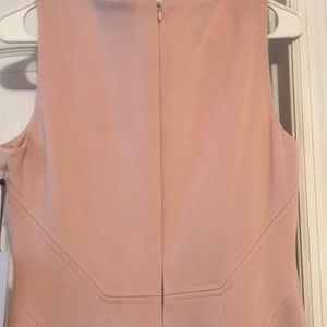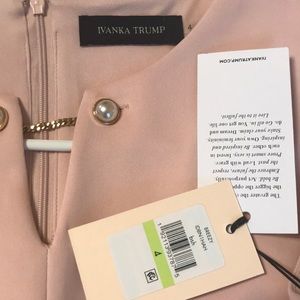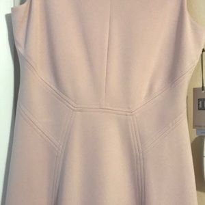 Pale pink flare at waistline, Pearl and gold chain decorative accent at small vneck. Knee length