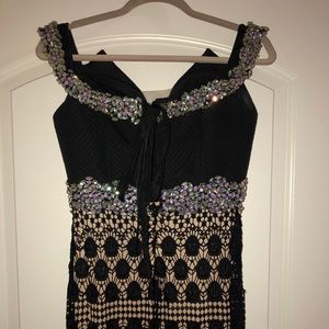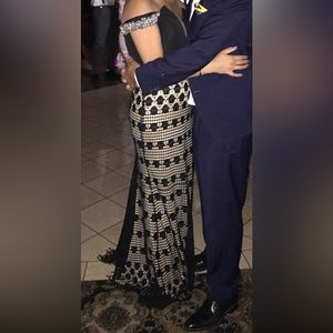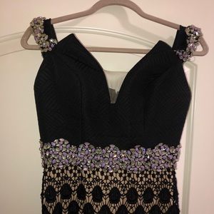 Long evening gown. Off the shoulder top corset with rhinestone in the middle and lace all the way down.