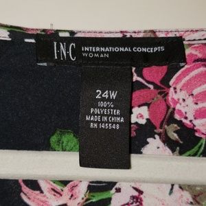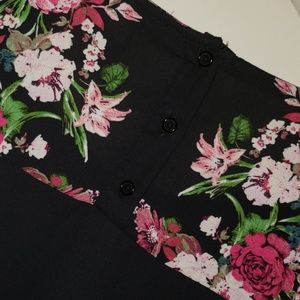 Floral sides and black middle panel with pleated bell sleeves. buttons on back no zipper.