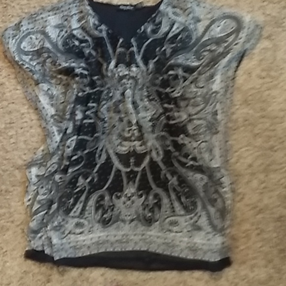 Black and gray dress that lands right above the knees. It does have a v-neck. Also there is a small tear right on the seam shown above in picture