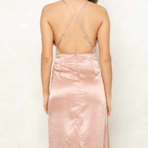 This style has a V neckline, adjustable crossover shoulder straps, pleat details on the bust and an invisible back zip.