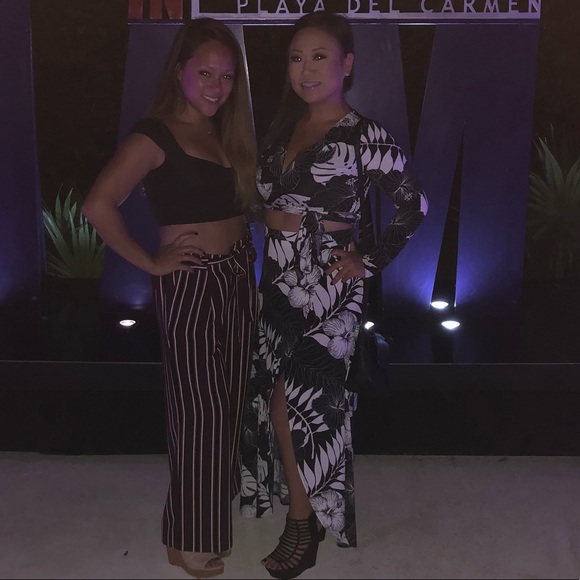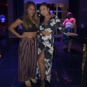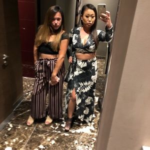 Light weight stretchy material. Long sleeve wrap around top. And the bottom is elastic waistband. One slit on the side. Very fun print yet settle bc it’s black and white. Worn only once summer 2018 in Mexico. Bought it from angl brand is blue blush