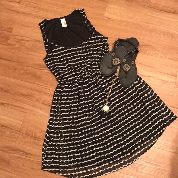 Black and white geometric stripe elastic waist sundress. Fully lined with spaghetti straps, waist measurement 12 1/2, stretch to 15 inches, pit to pit 17 inches shoulder to waist 15 inches, waist to bottom 18 inches, size medium. Francesca’s